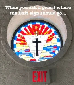 This week’s meme was a real nail-biter. The one we chose, at left, is an actual picture of the window in the children’s chapel that Tim mentions in the episode. What he didn’t mention, that I found completely HILARIOUS is that someone put the Emergency Exit sign right under it. The alternate, imagined and put together at my house, had a higher snark factor, but wasn’t quite as perfect. So we’ve included it here in the show notes so you can see how current we are here in the Gerbasi Household (and also how accurately it depicts Gini’s desire for Jesus not to leave us…)